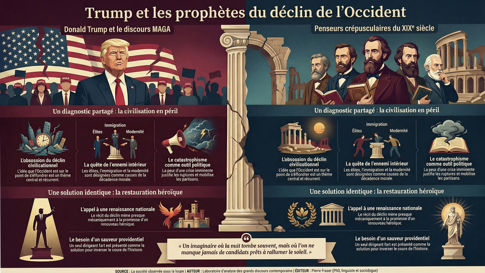 L’obsession de Donald Trump pour le déclin de l’Europe et la civilisation occidentale n’a rien d’original : elle réactive une vieille tradition intellectuelle, celle des penseurs crépusculaires du XIXe siècle qui voyaient déjà l’Occident sombrer sous le poids des élites défaillantes, de l’immigration et de la modernité. En fait, depuis le XIXe siècle, une lignée d’auteurs, comme Baudelaire, qu’on appelle parfois penseurs crépusculaires, ceux qui voient la modernité comme un long couchant civilisationnel, ont forgé une rhétorique obsédée par la fin imminente d’un monde.