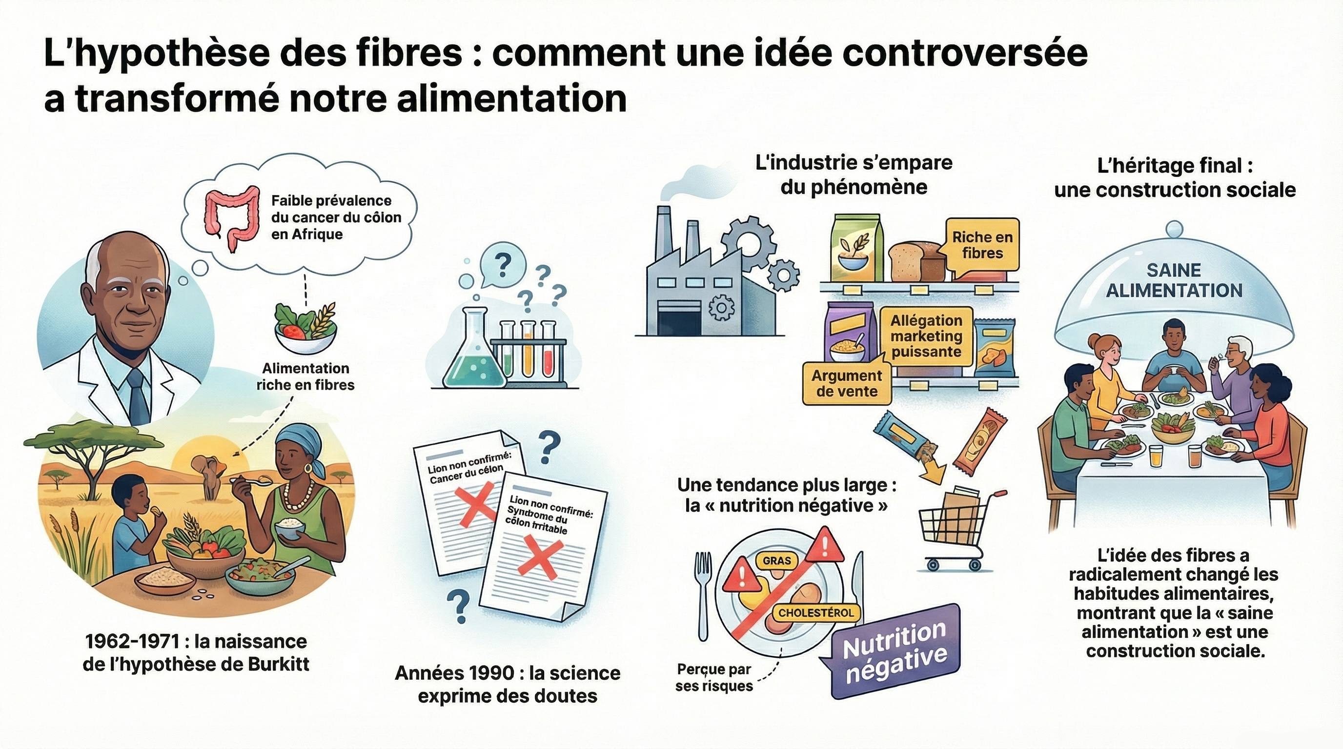 L’hypothèse de Dennis Burkitt selon laquelle les fibres protègent du cancer du côlon a déclenché, dès les années 1960, un immense mouvement scientifique, médiatique et industriel. Bien que plusieurs études aient infirmé ou nuancé ses conclusions, l’idée d’une fibre « protectrice » a été reprise par les médecins et exploitée par l’agroalimentaire pour créer une nouvelle grammaire du « manger sain ».