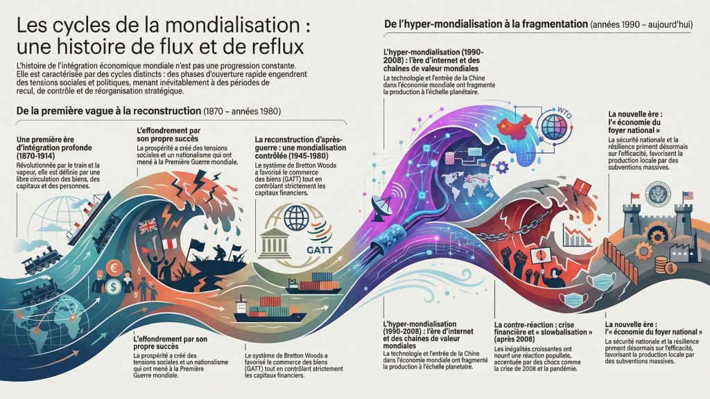 On décrit ici la mondialisation comme un cycle historique : l’hyper-intégration cède désormais place à une ère fragmentée priorisant la sécurité économique nationale.