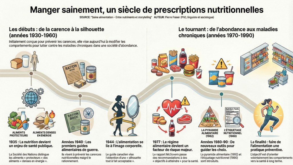 Cet article montre comment la saine alimentation s’est constituée, au fil du XXᵉ siècle, en objet central des politiques de santé publique des pays industrialisés. D’abord conçue pour prévenir les carences et renforcer la vigueur des populations, notamment en contexte de guerre, la nutrition devient progressivement un outil de gestion des excès liés à l’abondance alimentaire et aux transformations des modes de vie. Des recommandations de la Ligue des Nations aux rapports McGovern, les guides alimentaires passent d’une logique de prescription à celle d’objectifs nationaux, identifiant explicitement le régime moderne comme facteur de risque sanitaire. L’essor d’outils pédagogiques et de l’étiquetage nutritionnel rend ces normes visibles et intériorisables, installant durablement la saine alimentation comme une construction sociale orientée vers la prévention, la normalisation des corps et la responsabilisation individuelle.
