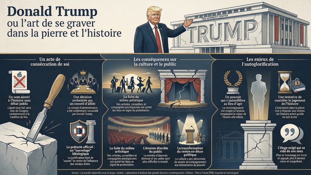 À Washington, les choses commencent parfois comme une boutade et se terminent en plaque commémorative. Le 19 décembre 2025, le nom de Donald Trump est apparu en lettres majuscules sur la façade du Kennedy Center, accolé à celui de John F. Kennedy. Sans vote du Congrès, sans véritable débat public, sans même la gêne rituelle qu’imposent d’ordinaire les institutions. Nietzsche y aurait vu une grandeur qui parle trop : ici, la reconnaissance ne vient plus après l’œuvre, elle la précède, la remplace et s’y substitue.