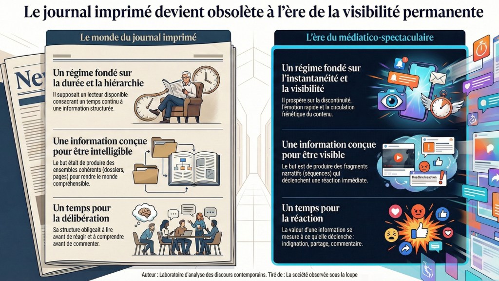 Le journal imprimé appartenait à un régime discursif fondé sur la durée, la hiérarchisation et la rareté. Il supposait un lecteur disponible, relativement stable, prêt à consacrer un temps continu à un monde présenté comme cohérent, même conflictuel. Autant dire une anomalie pour l’économie contemporaine de l’attention. Le médiatico-spectaculaire, lui, n’a que faire de la cohérence. Il prospère sur la discontinuité, la simultanéité, l’émotion rapide et la visibilité maximale. Dans cette configuration, le papier n’était pas simplement obsolète. Il était contre-productif.