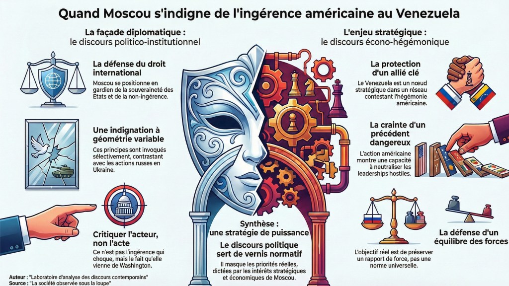 Indignation russe sélective : le droit international sert de décor, tandis que l’enjeu réel demeure la défense d’un équilibre hégémonique contesté.